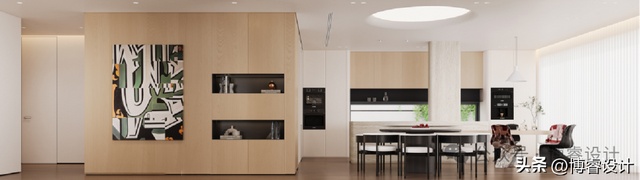 餐厅与西厨、品茗区相连,形成自然流畅的空间过渡。餐厅圆形的岩板餐桌搭配实木餐椅,增添了艺术的氛围。西厨封闭式吊柜+透明玻璃酒柜+多层抽屉储物,满足分区储物与美酒展示需求。弧形岛台扩充操作台面,满足多人备餐需求。