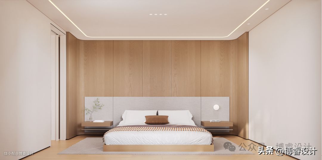 主卧的床头背景墙采用木饰面,加之温润的木地板,渲染一个温暖舒适的休憩空间。两侧设计悬空式床头柜,轻盈美观,兼具床头置物。