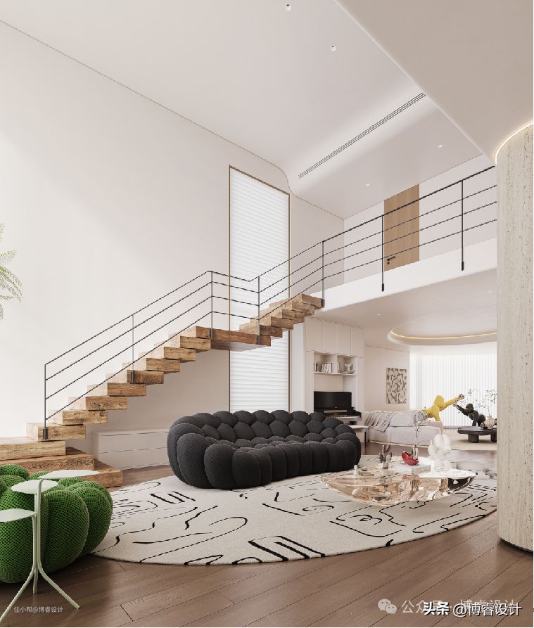 为了给孩子提供充足的活动空间,设置儿童娱乐区,拉近亲子关系,增强亲子互动性。泡泡沙发搭配肌理感的椭圆形地毯,凸显舒适放松的生活态度。内侧吊顶与侧边留空,呈现出悬浮式的视觉效果,同时增加线性灯,渲染出温柔静雅的氛围。