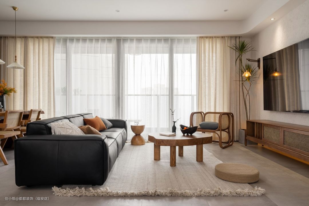 大面积的白墙与原木色木制家具,没有过多的色彩,再搭配素雅纱窗,如此简单、干净、纯粹,才能制造出更加轻松宁静的生活氛围。