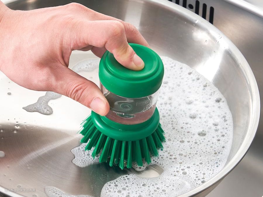 这款洗碗刷的设计理念挺不错的,但实际使用体验不行,主要是洗洁精很难挤,轻挤没反应,用力挤就出来一大坨,而且刷毛偏硬且不够密,总感觉锅碗瓢盆洗不干净。