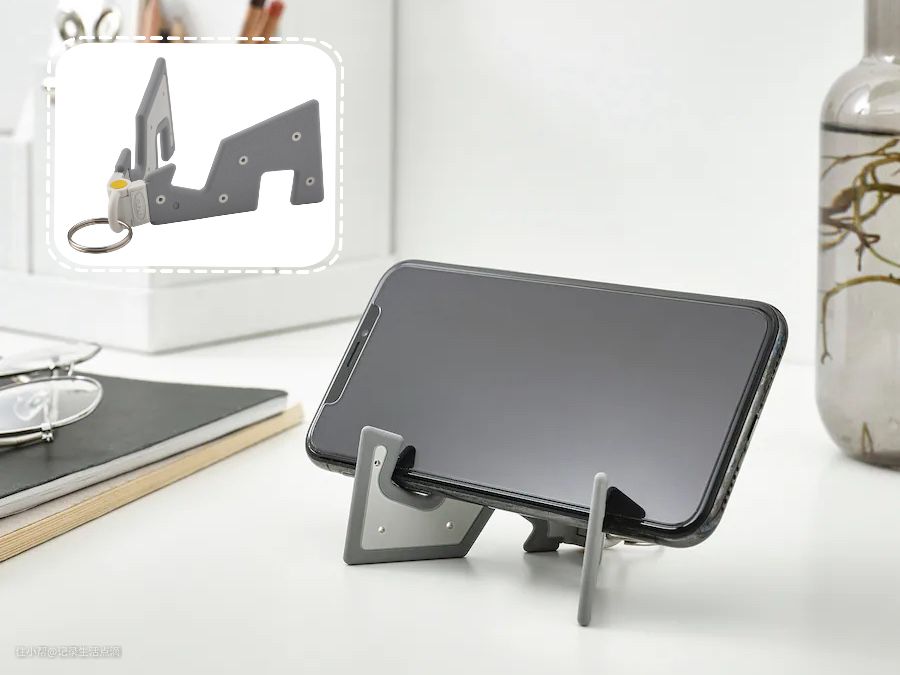 这是一款便携设计的手机支架,可挂在钥匙圈上随身携带,我就是把它和汽车钥匙挂在一起的。要用时打开就行了,随时随地都可以充当手机支架,有两个角度可以选,手机放上后很稳固,堪称解放双手的看片神器。