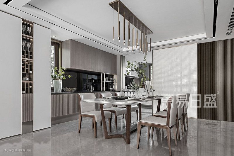 新中式风格餐厅将传统元素与现代设计巧妙融合。白色餐桌与餐具,彰显简约大气;绿色植物点缀其间,增添生机与雅致。吧台与椅子则传承中式精髓,尽显新中式韵味。