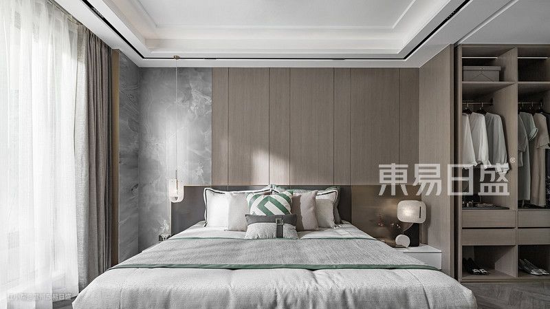 主卧柔和色调营造温馨氛围,大窗户引入自然光,沙发床提供宽敞休息空间。简约家具搭配传统元素,展现新中式魅力。墙上装饰增添艺术气息,提升居住品质。
