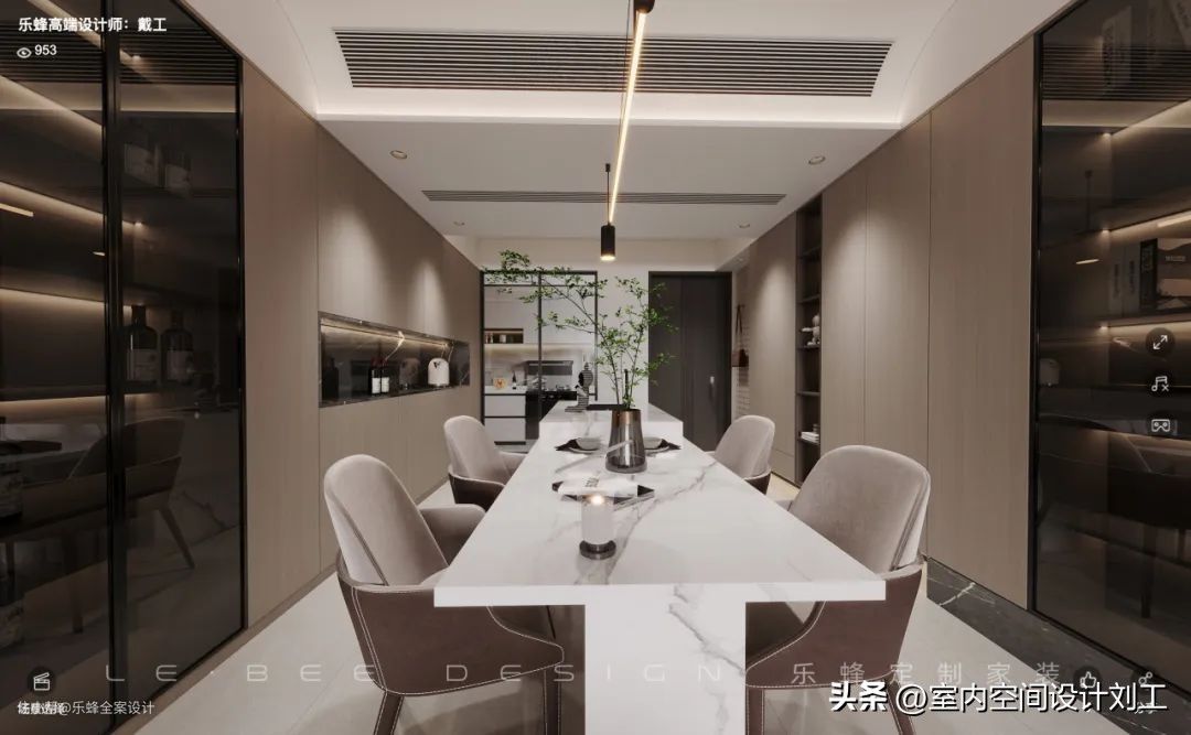 透明装饰柜配上氛围灯,营造出高级简约的氛围。嵌入式水吧台,不仅节省了空间,还增添了空间层次感,区域灯的装饰使得整个空间舒适而高雅。