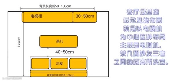 沙发和茶几之间的舒适距离为40~50cm这个距离方便坐在沙发上的人伸展双腿,并轻松拿到茶几上的物品。沙发背景墙和电视机之间的距离至少为 250cm。通常来说,电视柜的长度等于电视背景墙的长度减去 50~100cm,沙发的长度等于沙发背景墙的长度减100~150 cm,电视柜的深度为 35~50 cm。