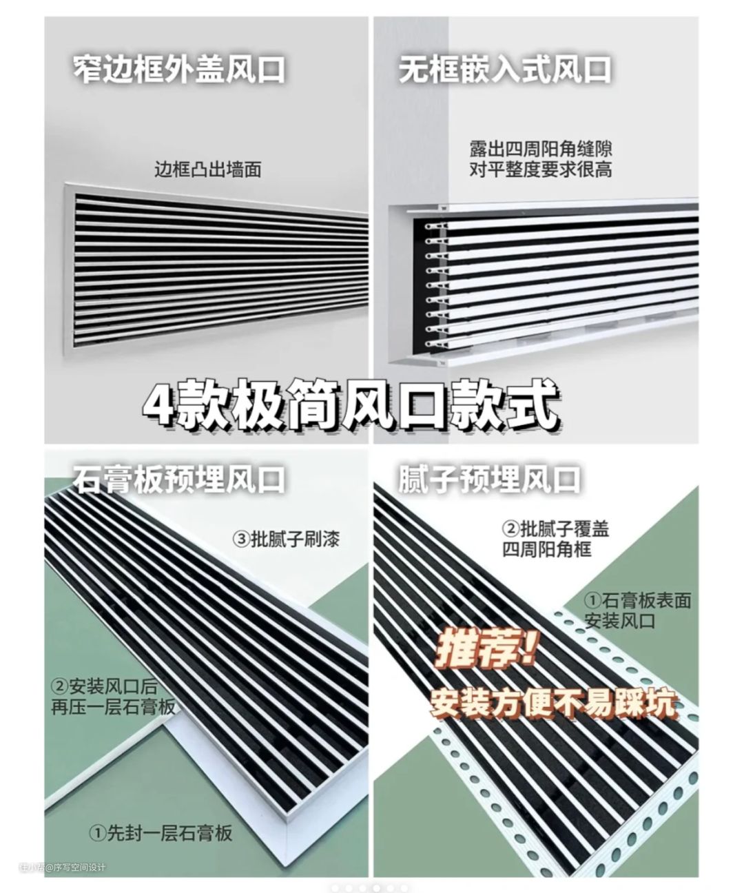 风口一般是铝合金百叶,坚固耐用,但是可能出现风口滴水,一般是白色的,想做其他颜色通常要加钱;也有ABS塑料或木质的风口,不容易滴水,形状和颜色比较多,可以根据吊顶风格来选择。