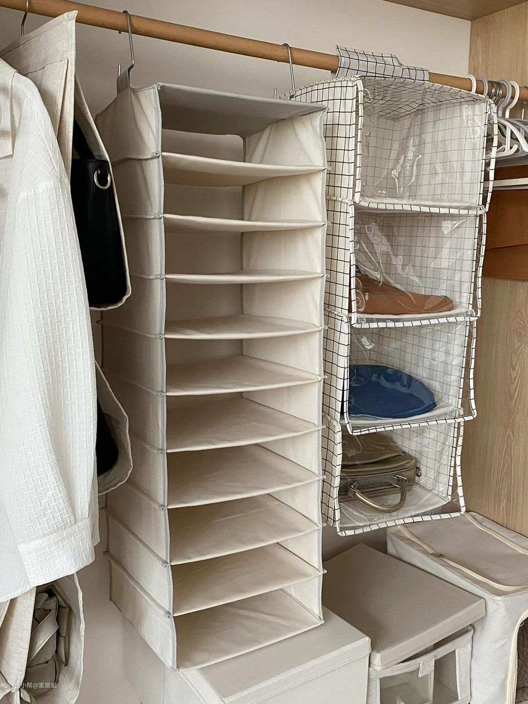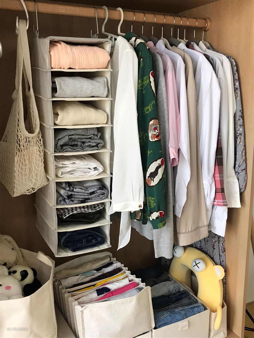真是千奇百怪的收纳方式,衣柜内挂袋,中间每一层都是有隔板的,挂在衣柜里能放好多衣服,不用的时候折叠起来完全不占地,以为挖到宝了。
