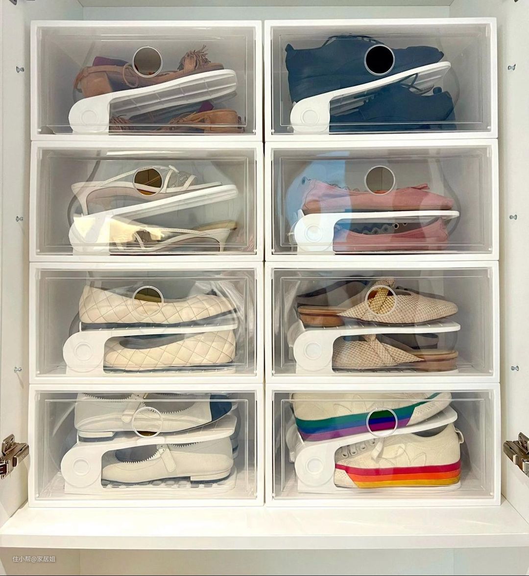 把鞋盒都扔了改成下图中这种透明的亚克力收纳盒,既能防尘又可透视,是方便拿取还是鸡肋?