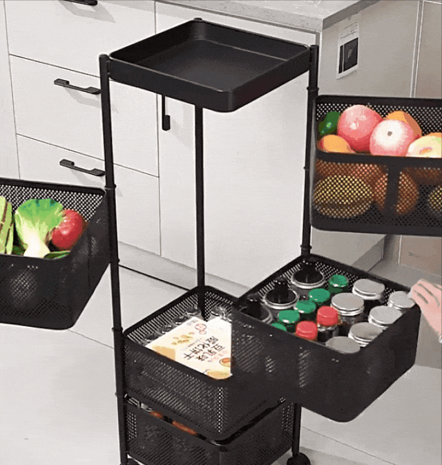 360度可旋转的置物架,能放蔬菜、水果,有多层可选,每一层都是可以旋转抽出来的。