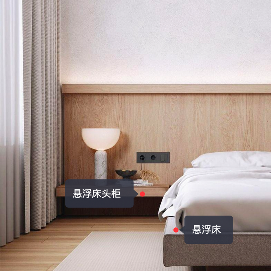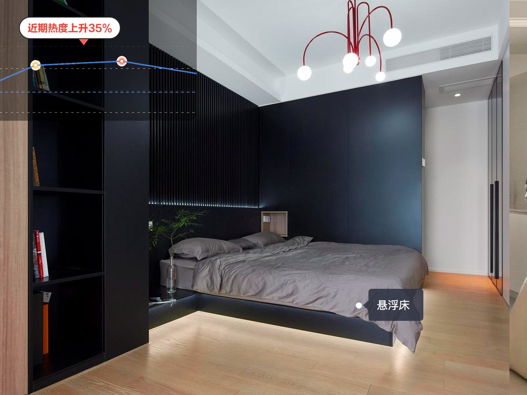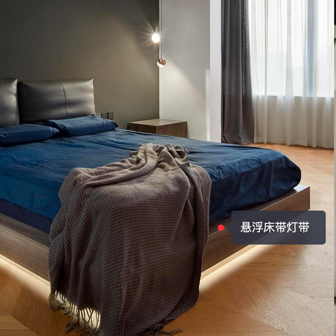 悬浮床:床体与地面之间采用悬浮的设计,通常通过支架或隐形支撑实现。这种设计可以使床体看起来更加轻盈、自由,整个空间看起来更加通透。