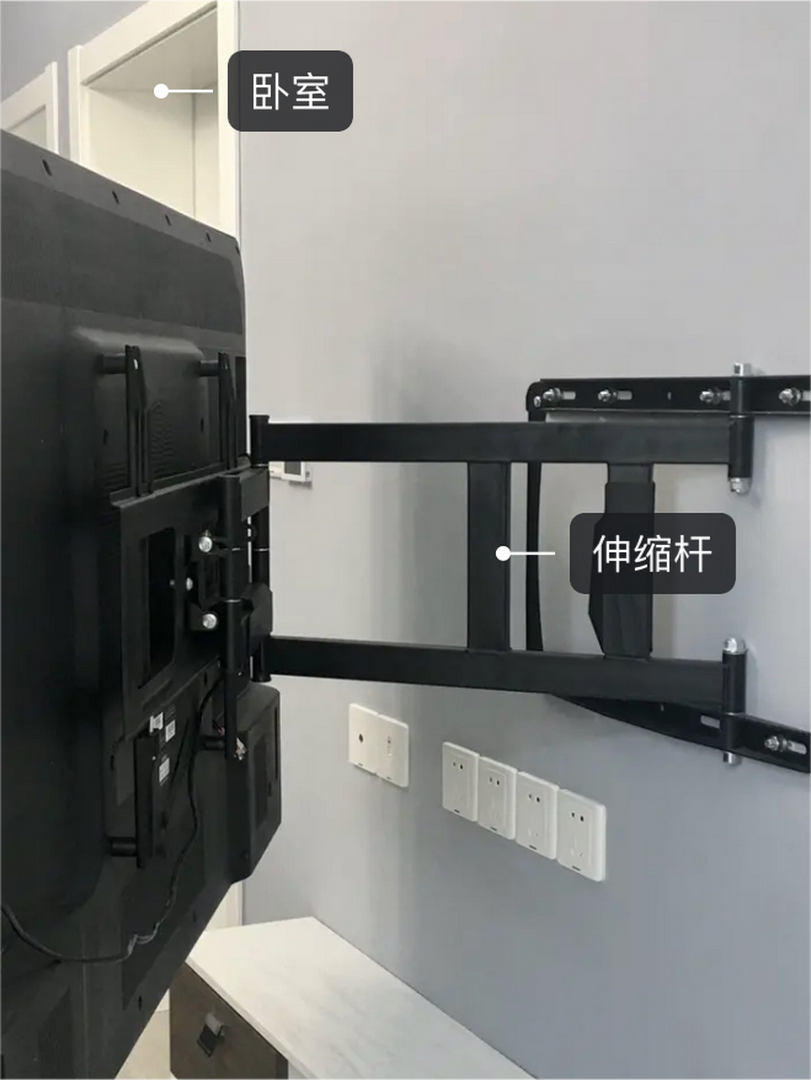 特别注意:1.四周边框距离电视机的尺寸最好不超过20mm。2.为了电视安装方便,且为了实现电视墙全嵌的效果,电视支架推荐采用折叠推拉的形式。