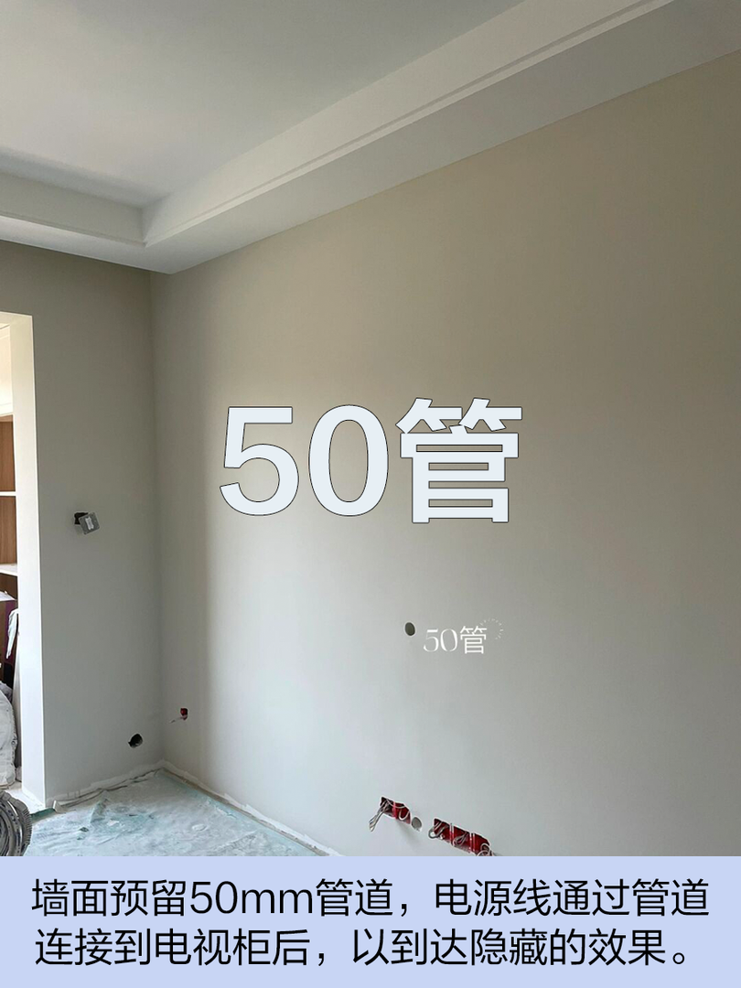 特别注意:如果电视墙的位置正好是承重墙,不能采取“50管”的方式来做线路隐藏,只能裸露线路或用柜体隐藏。