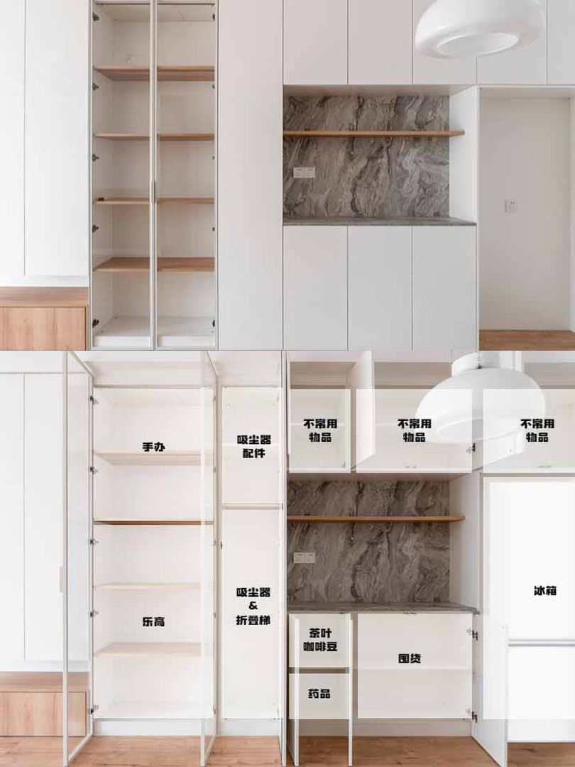 餐边柜在包含冰箱的同时,还可以同时与展示柜相结合,颜值提升不少,喜欢的物品也有了放置的地方,还能作为酒柜使用,好用又好看。