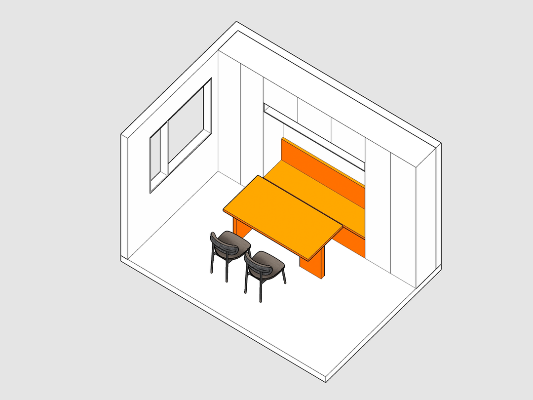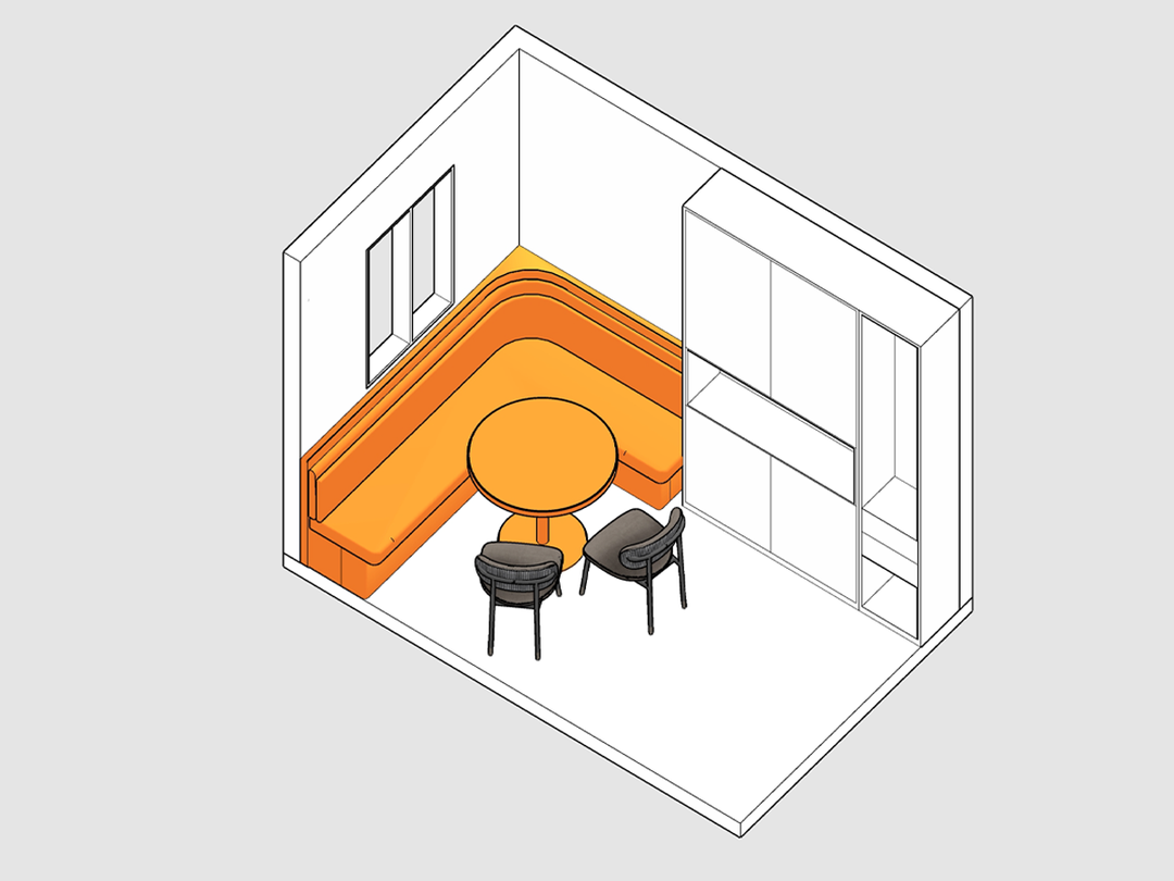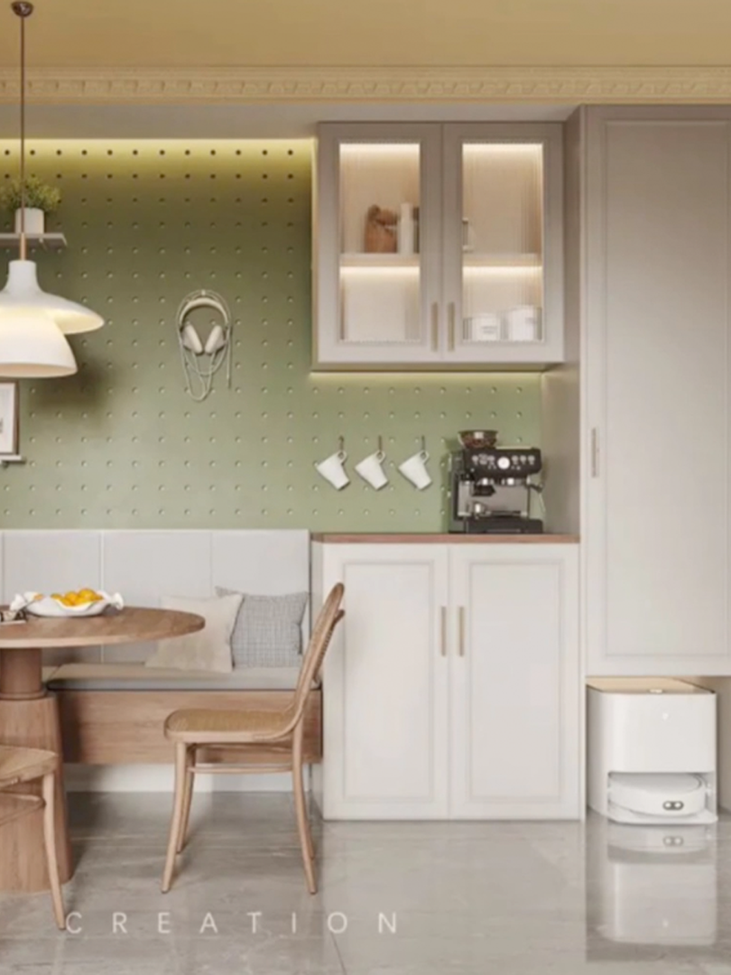 一字型餐边柜和卡座一体设计,搭配活动餐桌和餐椅。座位下方可设置地柜,卡座旁打造餐边柜,可以留出平台方便顺手摆放物品。