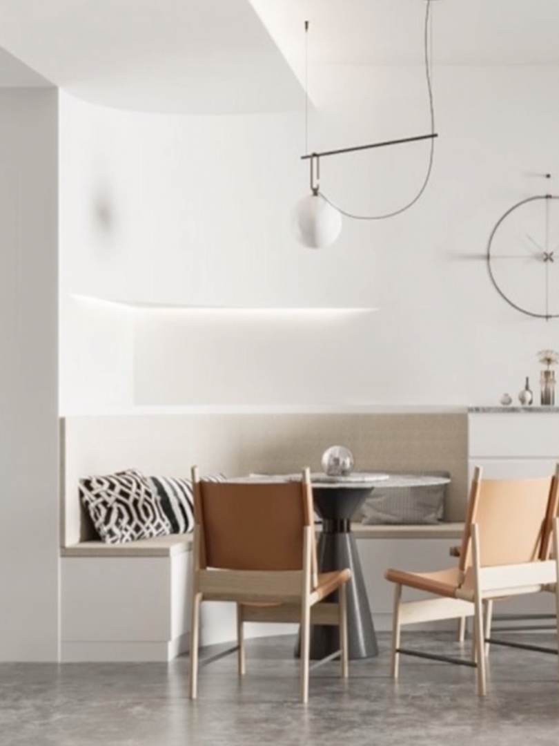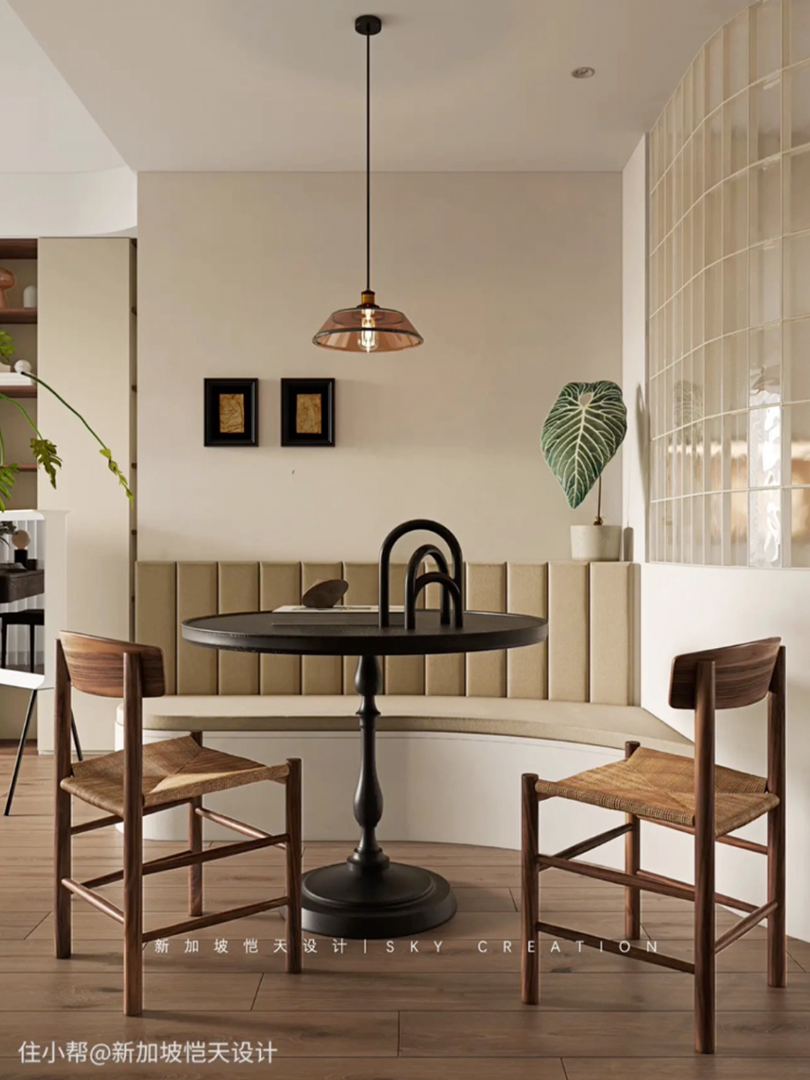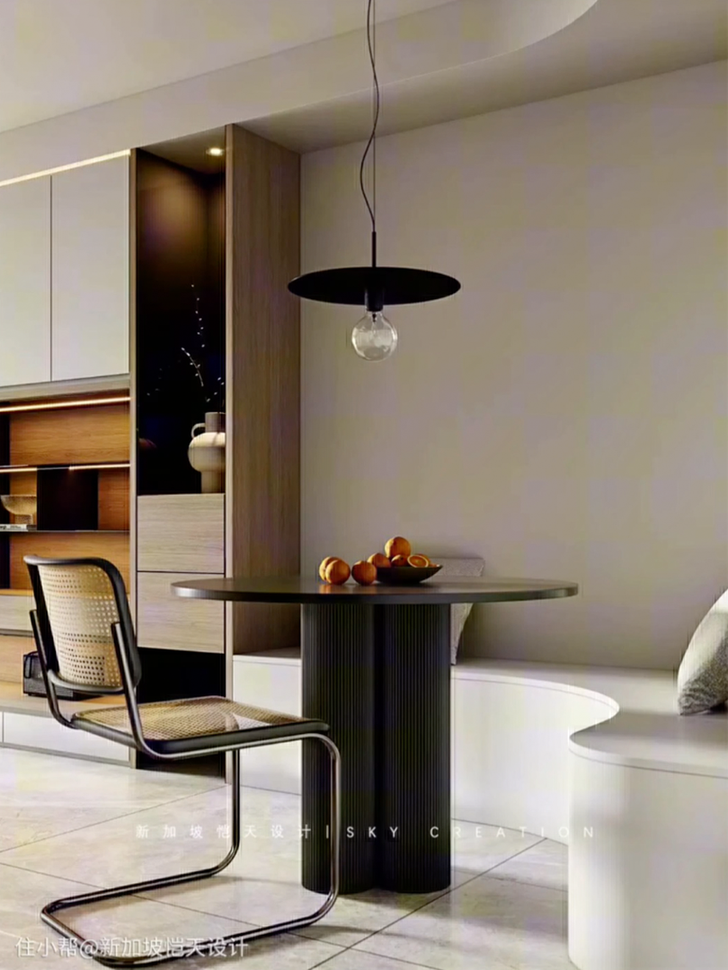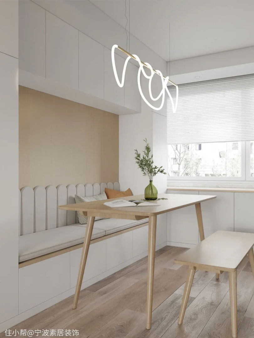 利用转角空间,做L形座位,结合圆桌形成围合式餐区,还可以靠墙做餐边柜,不仅节省空间,还留出了收纳区域,人多时可以增加椅子数量,灵活方便。