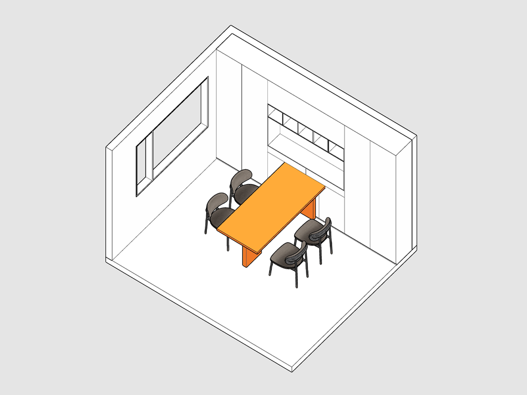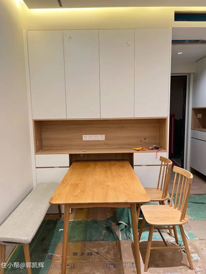 空间有限的情况下,餐桌与餐边柜叠加,在收纳柜按照餐桌尺寸留出空隙,方便收纳,非常适合小户型,餐桌可以灵活变化调整。