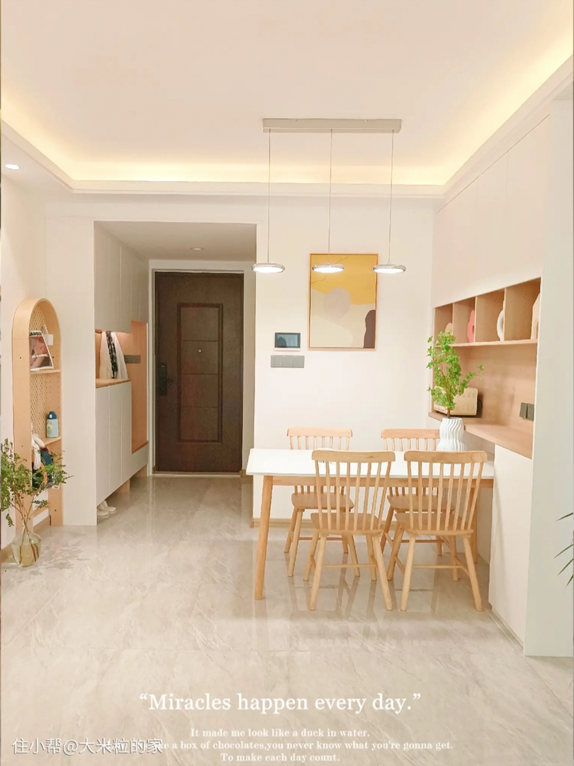 小户型的餐厅,建议把餐桌椅与餐边柜组合在一起,更能充分调动空间。