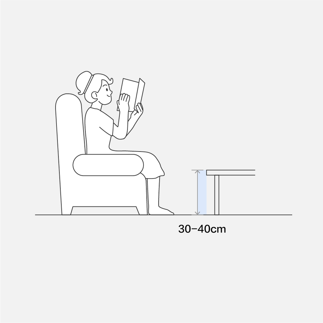 建议茶几台面离地30-40cm,且茶几高度需高于沙发座位高度,但不要高于沙发扶手。