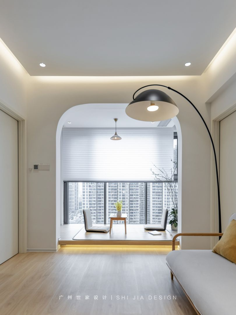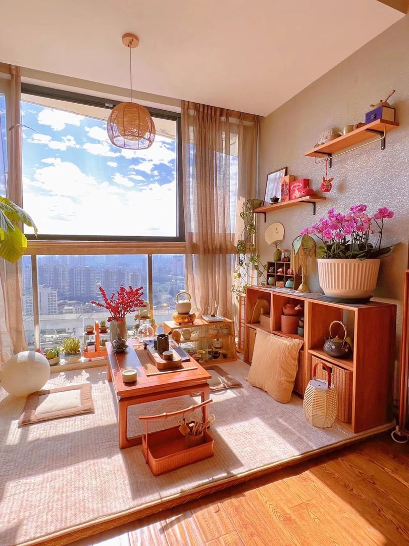 适用于日式和新中式风格,通常茶几居中放置于地台/榻榻米上;茶几高度适当降低,搭配小茶桌,可用作休闲区或小型茶室使用。