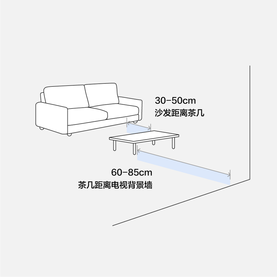 茶几处于沙发和电视的中间,距沙发的最佳距离为30cm以上,距电视的最佳距离为60cm以上;
