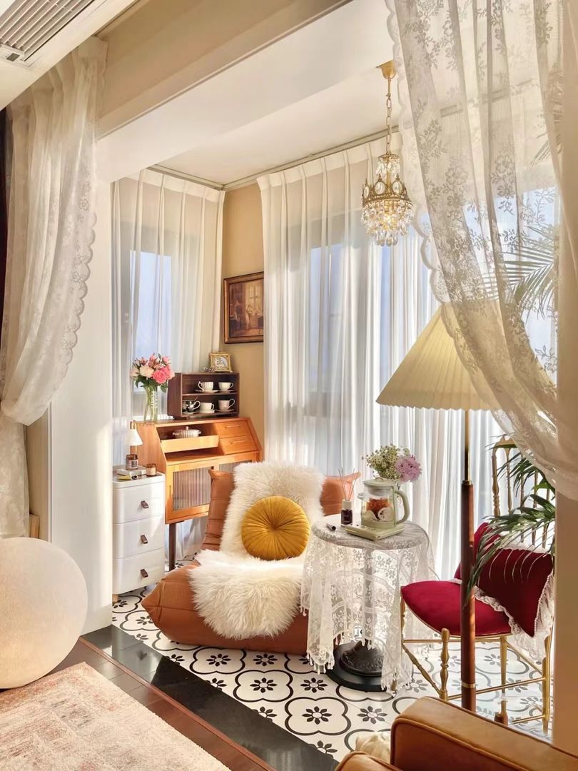 阳台作为绝佳的休闲空间,通常会用单人沙发/单人椅搭配边几,放在阳台一侧;