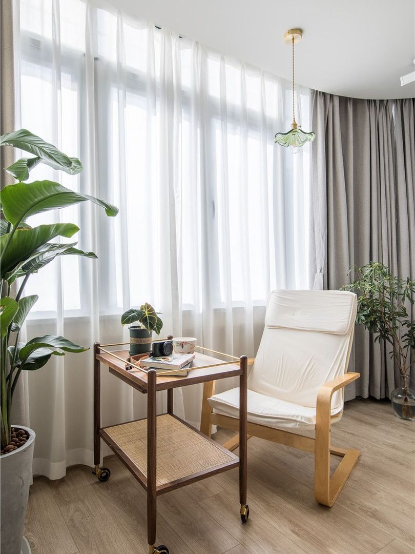 最常见的阳台茶几布局方式,对空间限制小;通常是体块较大的单人沙发搭配小边几,既不会显拥挤,又能拥有一个采光绝佳的休闲空间。
