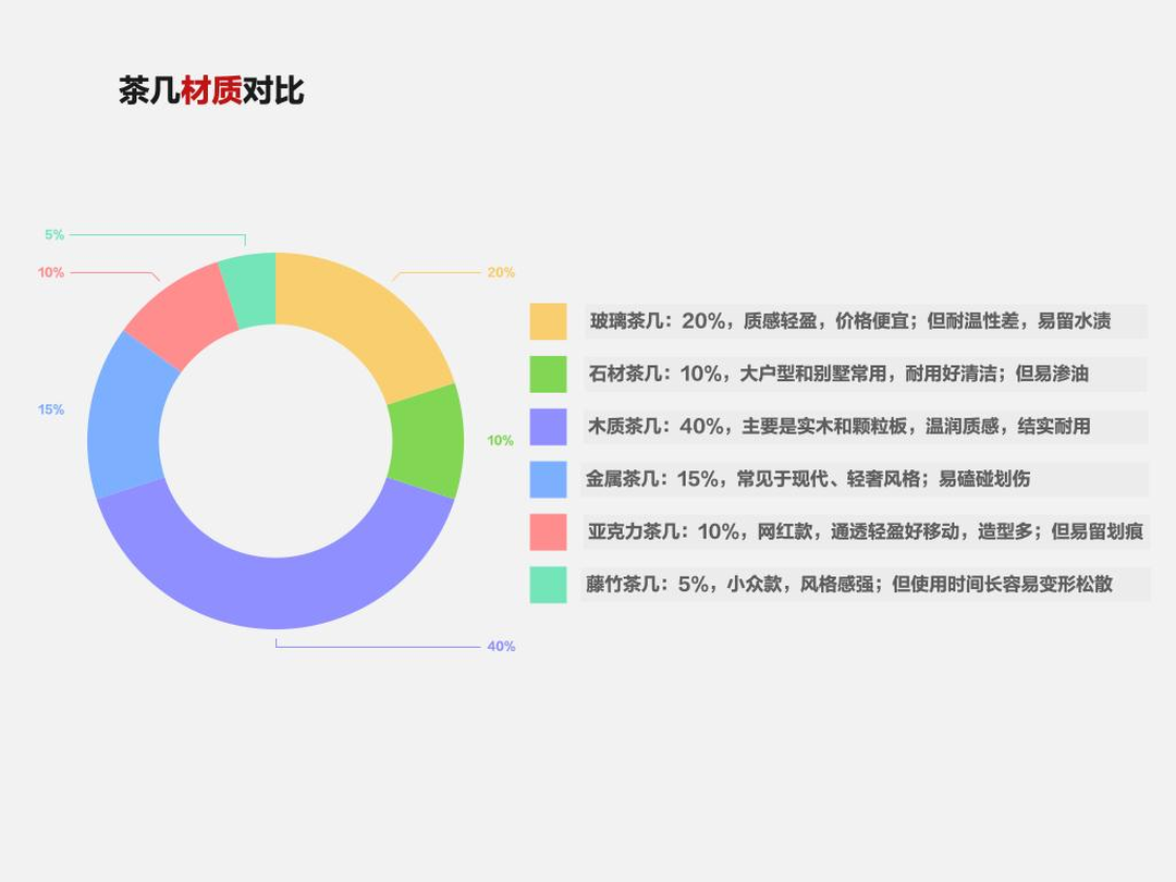 - 材质选择:预算不高选木质(颗粒板)茶几;预算充裕选石材茶几、金属茶几。