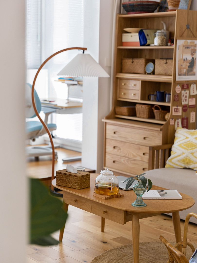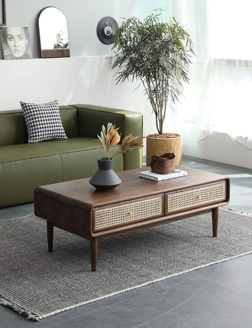 木质茶几是选购主流,百搭耐看;藤竹茶几是比较小众的选择,通常跟其他家具组合出现。