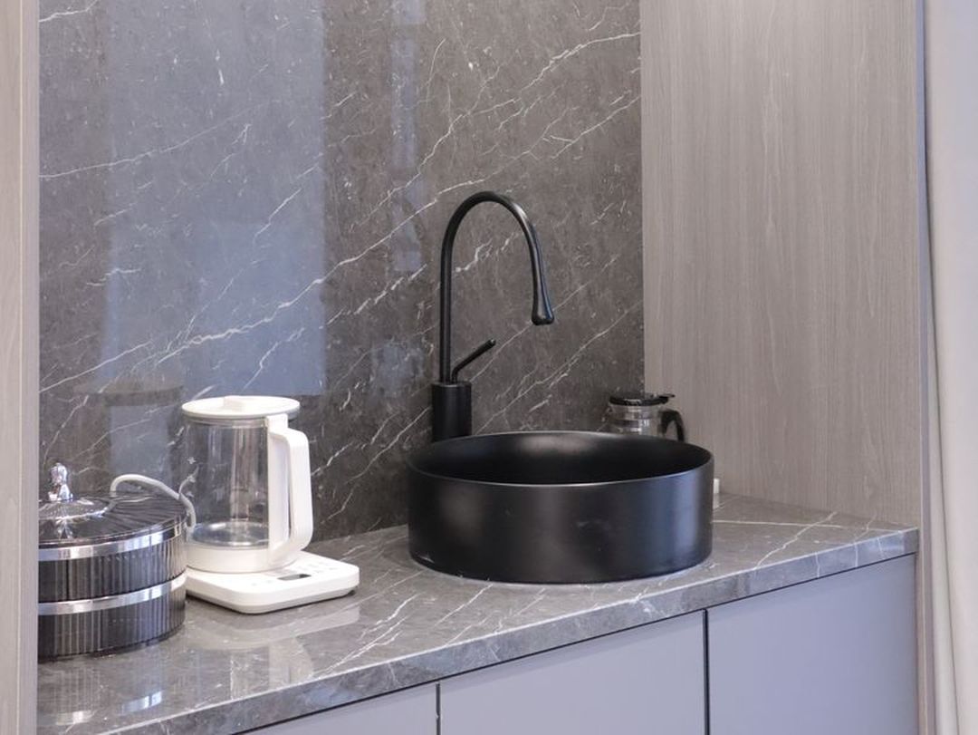 - 附近有地漏或排水管,或相邻空间是厨卫等用水空间,建议靠墙做水吧柜,增加水槽和净水设备,方便取水和清洗茶具的同时,饮水泡茶更健康。