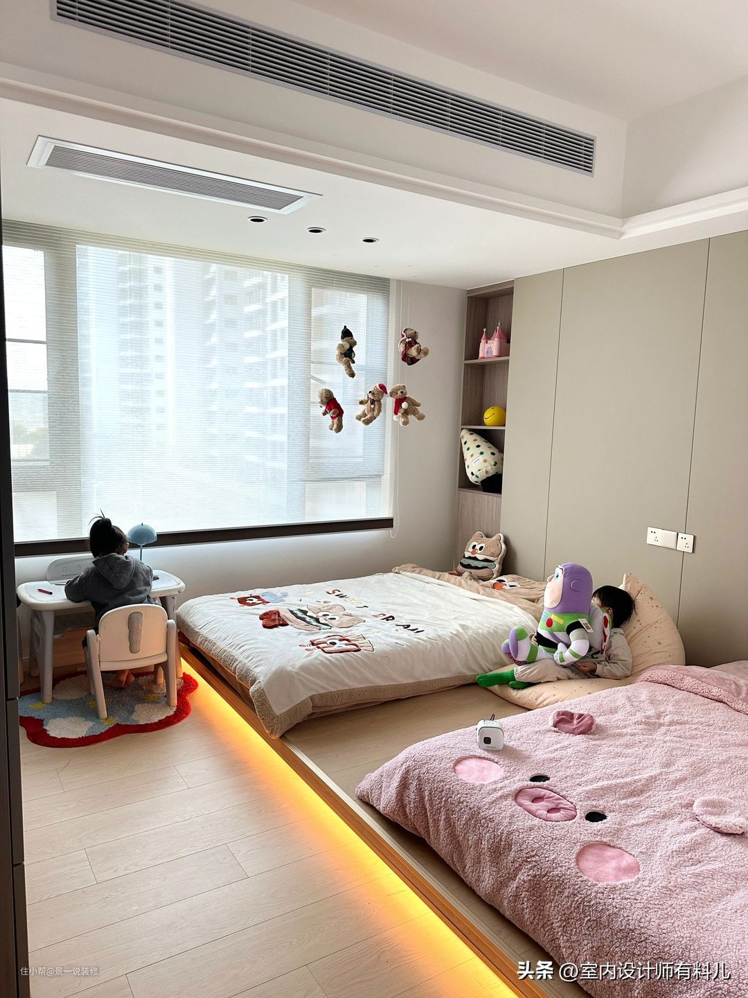如果是有娃家庭,两个孩子要跟着一起睡,增加一个床垫就可以了,方便照顾娃,也不至于太拥挤。