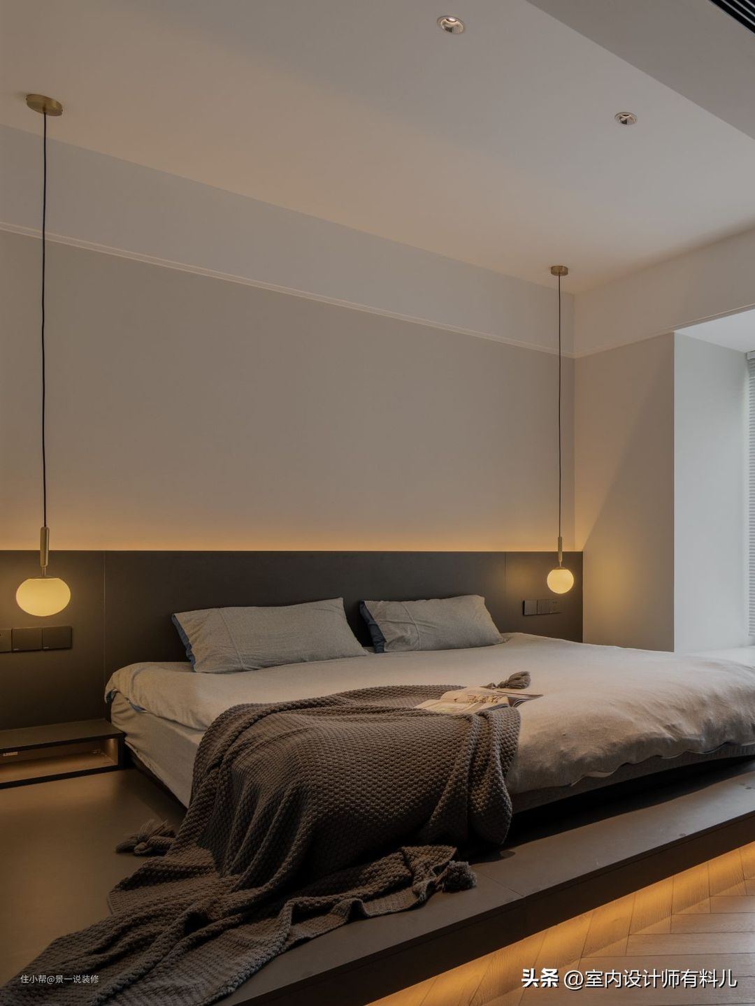 地台处内嵌灯带,打造出一个舒适的睡眠环境,同时,低矮的设计也很有安全感。