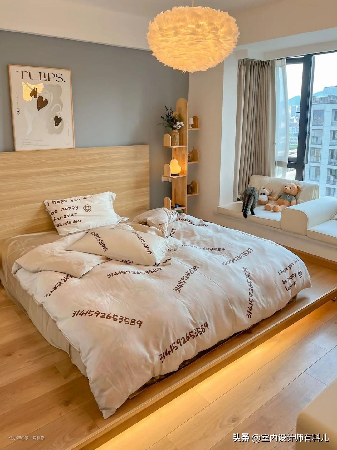 其实整个卧室造价只有1万+,好看又实用。地台高度是20cm,通顶衣柜做在地台上,整体效果更好,飘窗放上两块垫子,喝茶聊天很惬意,这样的地台床卧室,越住越喜欢,就像是平淡生活里的一束光,每天都在治愈我~