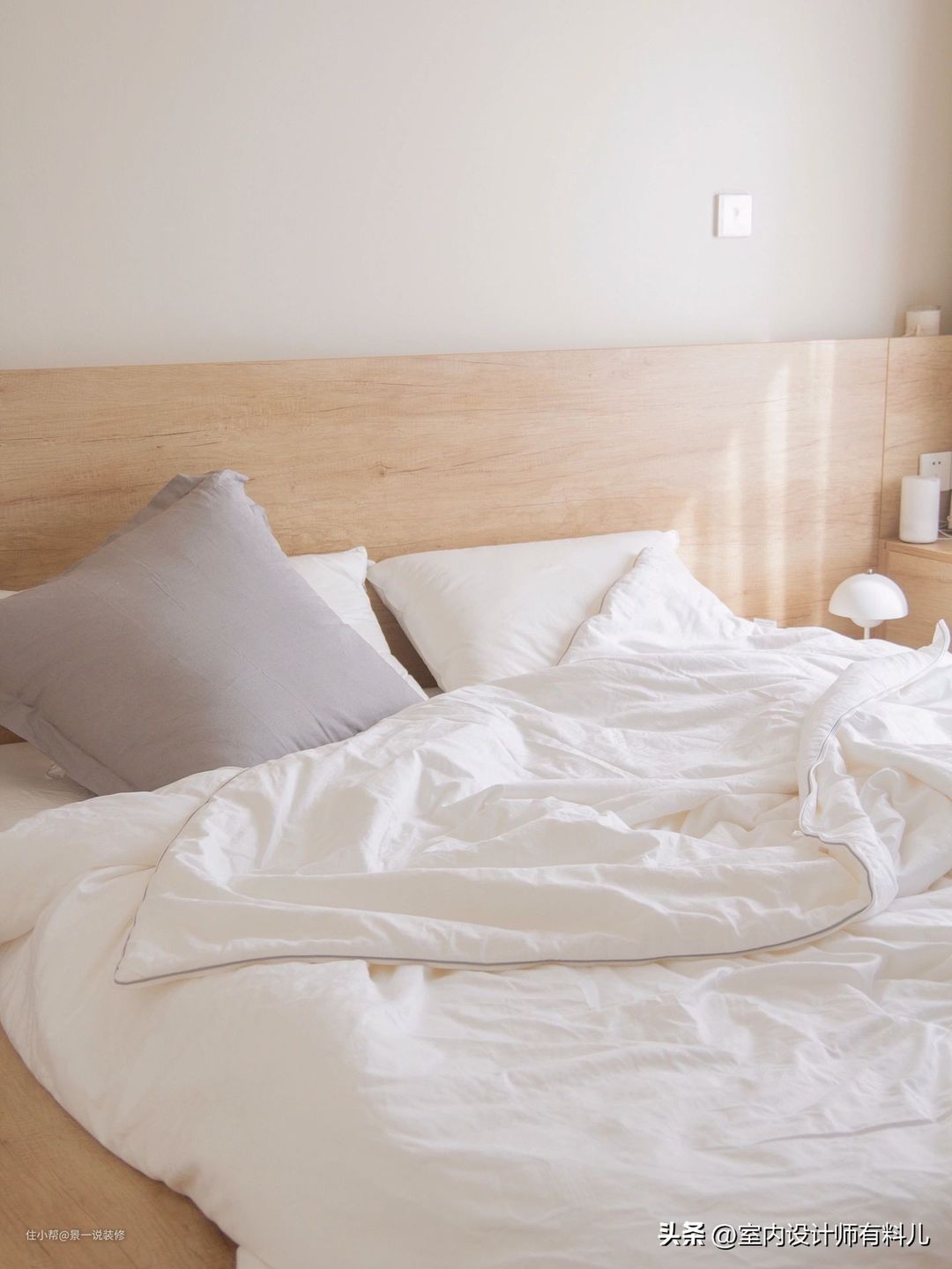 地板颜色很好看,床面和立面的对接没有使用压条,是八字对缝。床头欧松板打底,后期用的9厘板作为床头饰面板,是全屋定制给搞定的。