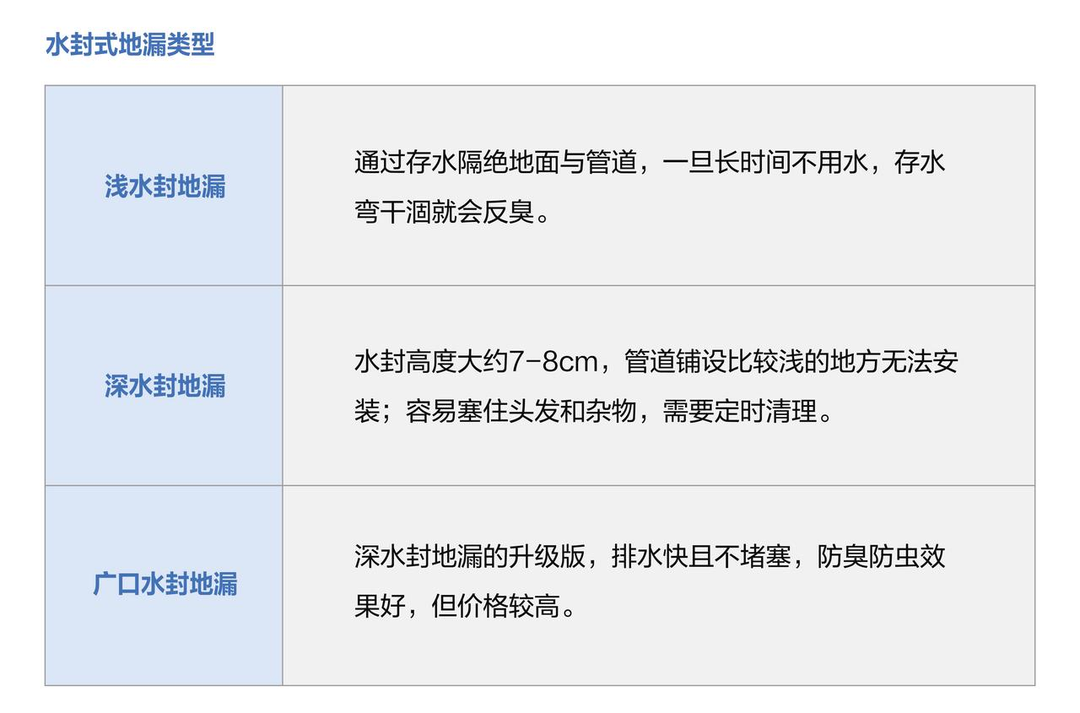 有浅水封、深水封、广口水封三种,更推荐深水封地漏,价格较便宜,防臭效果更好。
