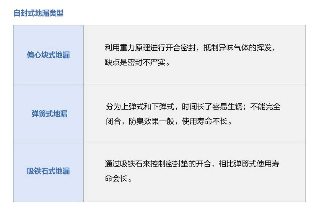 只要有存水,就能保证防臭效果;没有磁铁、弹簧之类的易耗物件,使用寿命更长,性价比高。