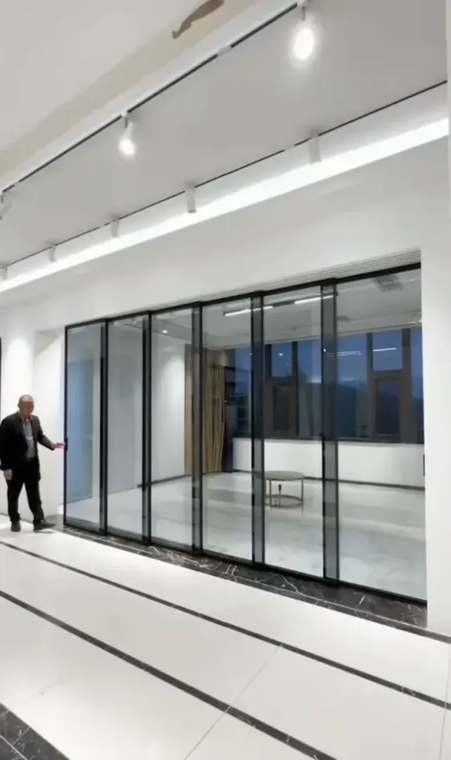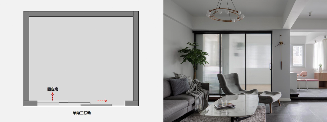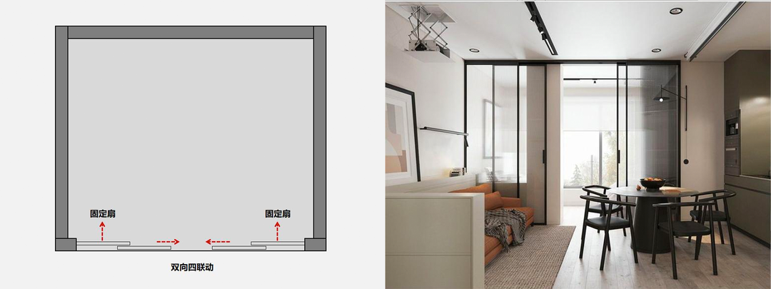 适合情况:一般适合在两个相对开放的空间里面,中间采取固定的玻璃,两侧的玻璃可以向中间进行联动收纳。