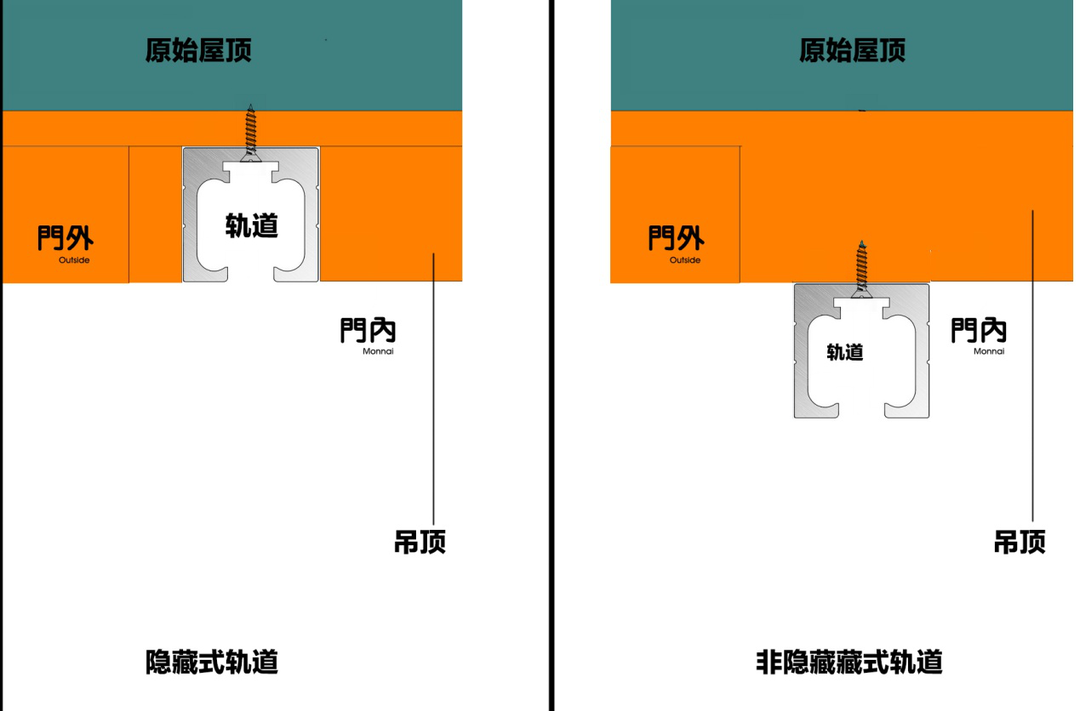 吊轨推拉门是指在门的上方安装轨道,而地轨推拉门则是在门的下方安装轨道。