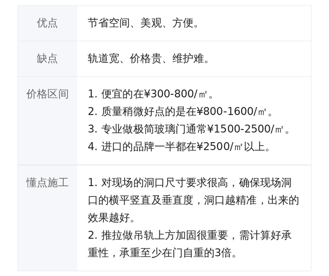 滑轨:选金属轨道强度高,更耐用,滑轨承重能力应达到门扇重量数倍以上。