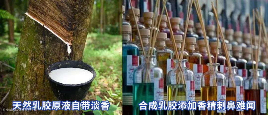 ②从气味上来看,天然乳胶是由于材料中的橡胶蛋白,自带淡淡的橡胶味,可以有效的抑菌防螨。而人工合成的乳胶用香精勾兑出来的气味非常刺鼻难闻,是为了掩盖其他添加剂散味,没有防螨抑菌的功效。对气味比较敏感的小伙伴们,尽量避免床垫中加入乳胶等自带气味的材料,会睡得更加舒适些。