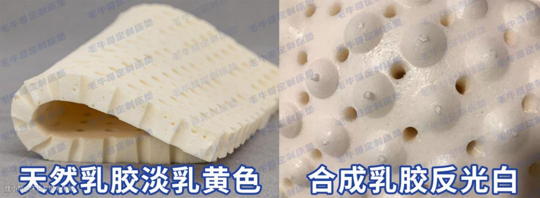①从颜色上来看,天然乳胶呈现一个淡淡的乳黄色,经过像蒸面包一样的蒸发工艺发泡而成。而人工合成乳胶,则是添加了大量的剂,比如滑石粉等不安全会致癌的材料,以低成本来模仿天然乳胶,从而以假乱真。但是一拿出来对比,就能明显看出非常惨白。