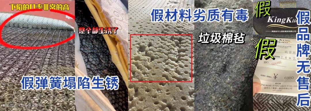 假床垫品牌=假弹簧+假材料,这样的床垫虽然便宜,但支撑弱睡感差,用不了一两年内部弹簧就会塌陷,材料就会老化变成碎渣。比起眼前的那几十几百块钱,就搭上自己的身体健康和宝贵的时间,结果到头来睡了一两年床垫就塌了,还得再花钱买新床垫,因为正品的售后服务根本不会管你假床垫的质量问题!