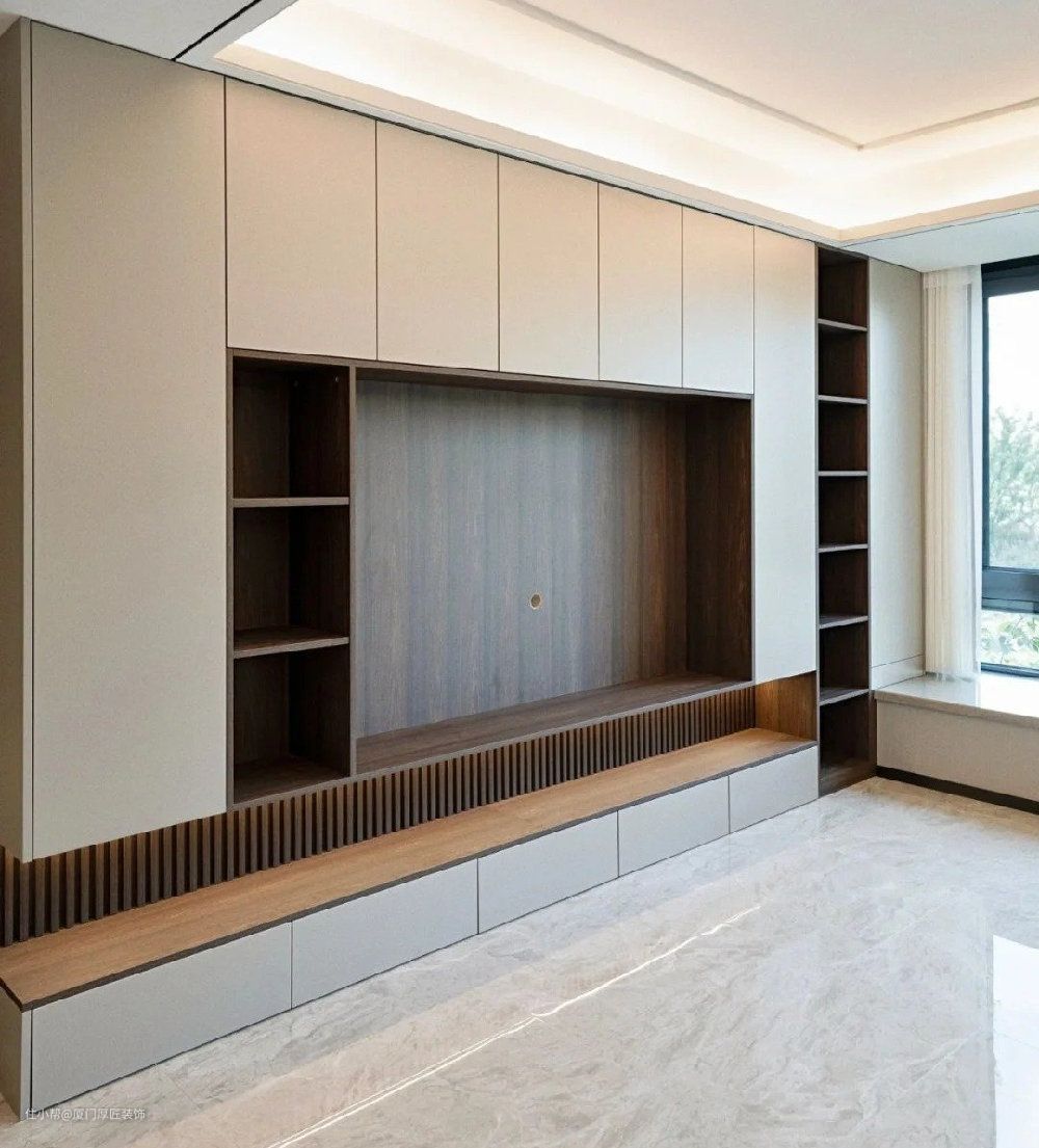 这几年随着去客厅化的流行,传统的电视背景也慢慢被电视柜取消。从装饰到实用性收纳的转变,似乎家里每一寸可开发收纳都用上了。