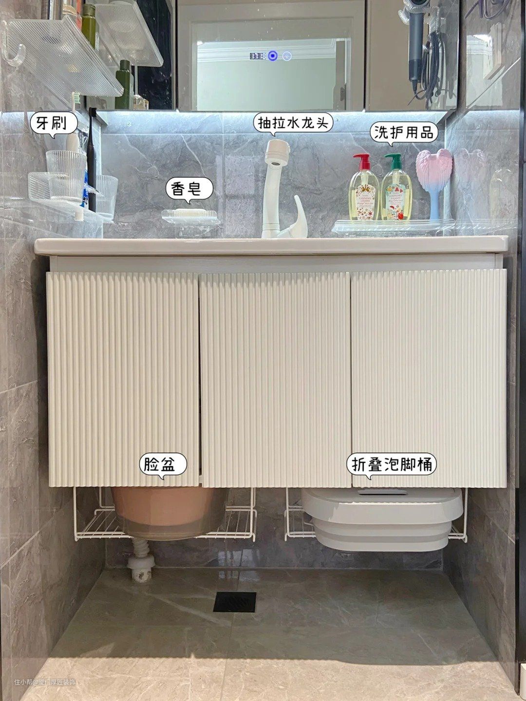 卫生间里,除了洗脸台外,一般还会有活动的洗脸盆,婴儿澡盆,甚至是泡脚桶。本来卫生间的面积就不大,如果这些活动盆没有事先考虑怎么收起来。以后整个卫生间乱不说,还会越用越小。