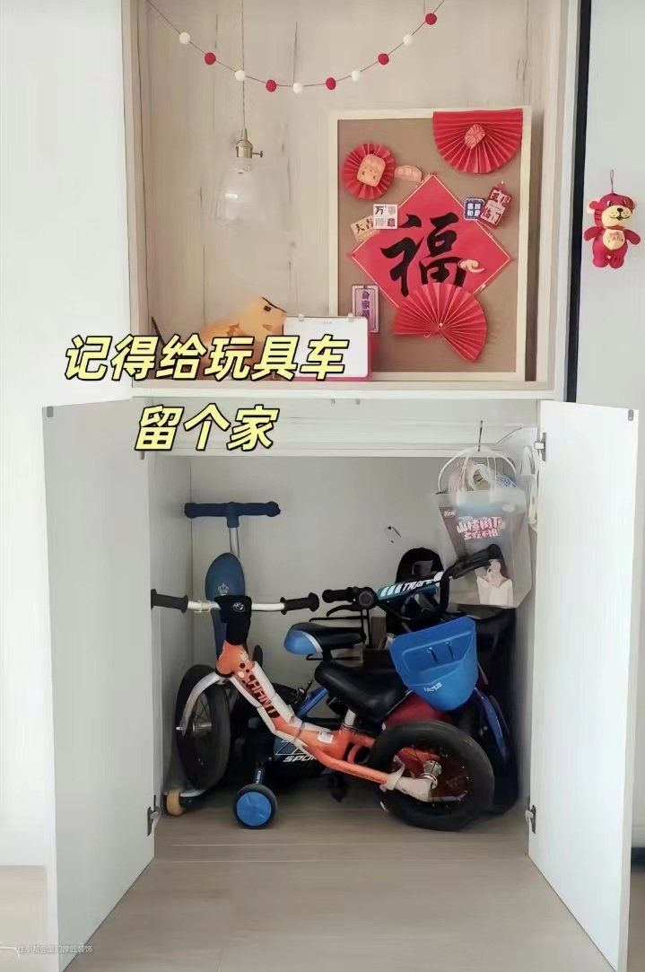 玩具车收纳也经常被忽视。玩具车一般是在楼下使用,进了室内最好收纳起来。不然小朋友会在客厅骑行,制造出噪音,影响邻里关系。