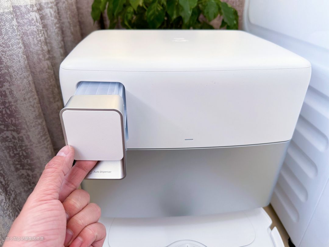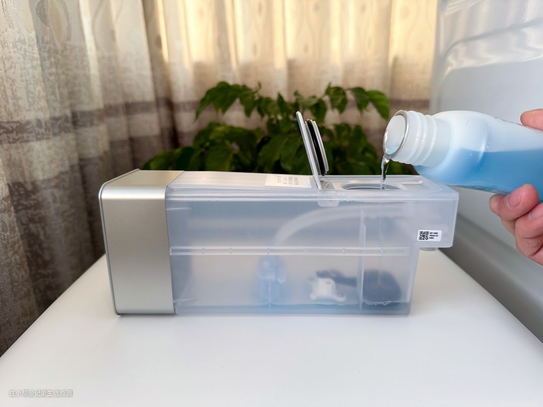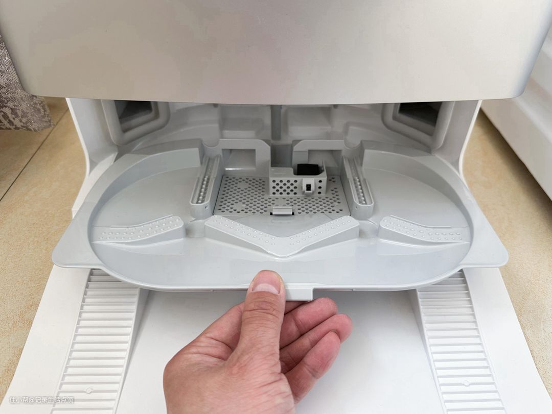 清洁液盒采用了抽拉式设计,补充清洁液时可以把整个清洁液盒取出来,清洁液余量低时在App中会有提醒。