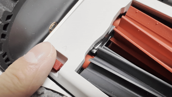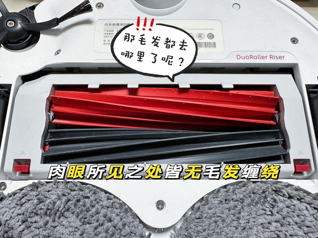 吸干净地毯上的毛发后来看看双螺旋胶刷上有没有缠绕毛发,肉眼所见之处皆无毛发缠绕。由于螺旋胶刷的特殊设计,缠绕在胶刷上的毛发会朝两端汇聚,而两端设计有刀片会把毛发切断,最终全部被吸入尘盒中。