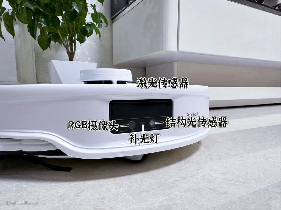 石头P10S Pro搭载了AI动态避障引擎,结构光传感器和RGB摄像头分工合作,前者可精准测距,避免误撞和卡困,后者可识别障碍物,在光线不足的环境下,中间的LED补光灯会自动开启。