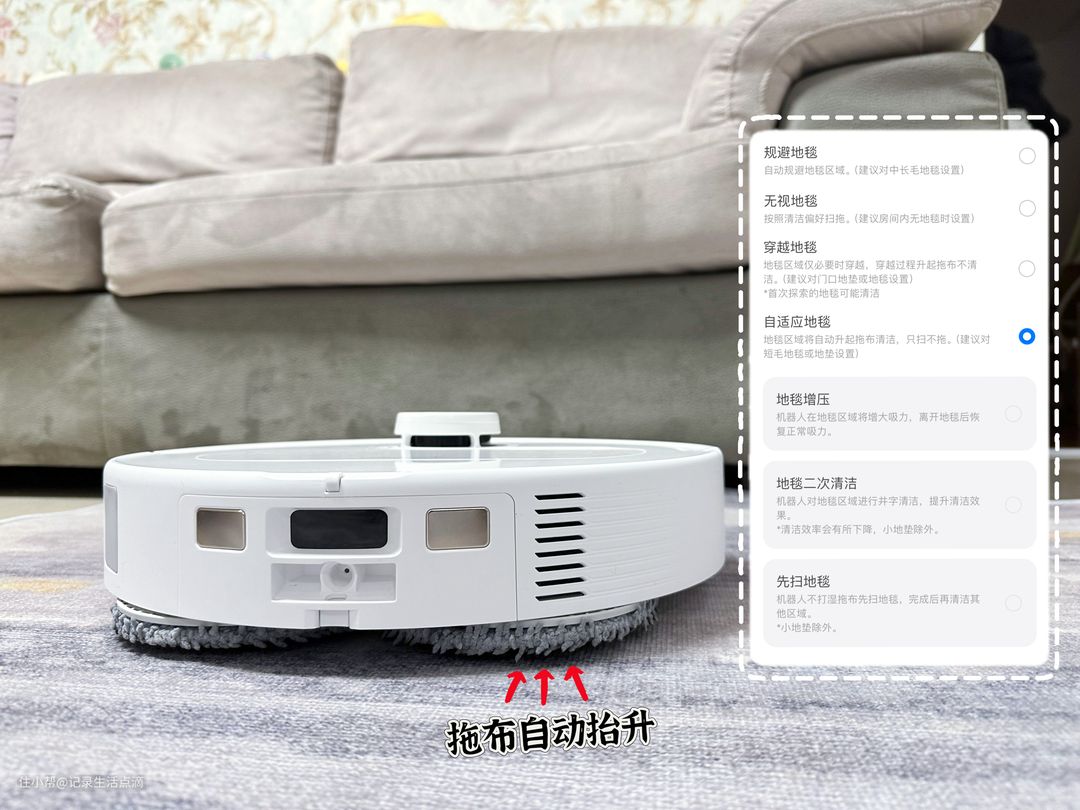 遇到地毯时,石头P10S Pro的拖布会自动抬升,抬升高度可达10mm,避免湿拖布污染地毯,这点对铺了地毯的家庭特别友好。