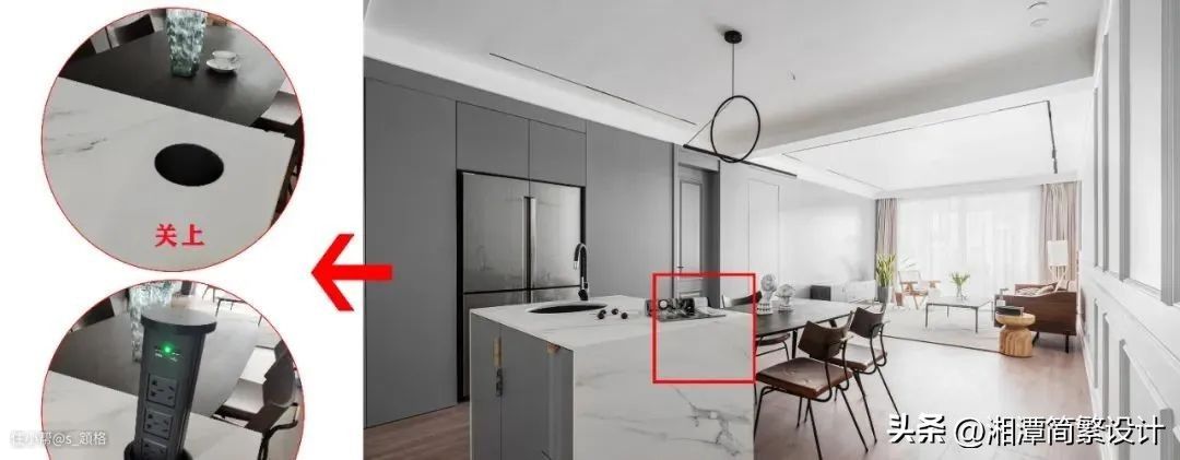 尤其适合四面都不着墙的岛台,选择这种升降插座可以完美解决用电需求:
